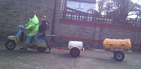 Thanks to the Vespa's gearing it will tow one trailer up to around 60ish and two at about 50ish,